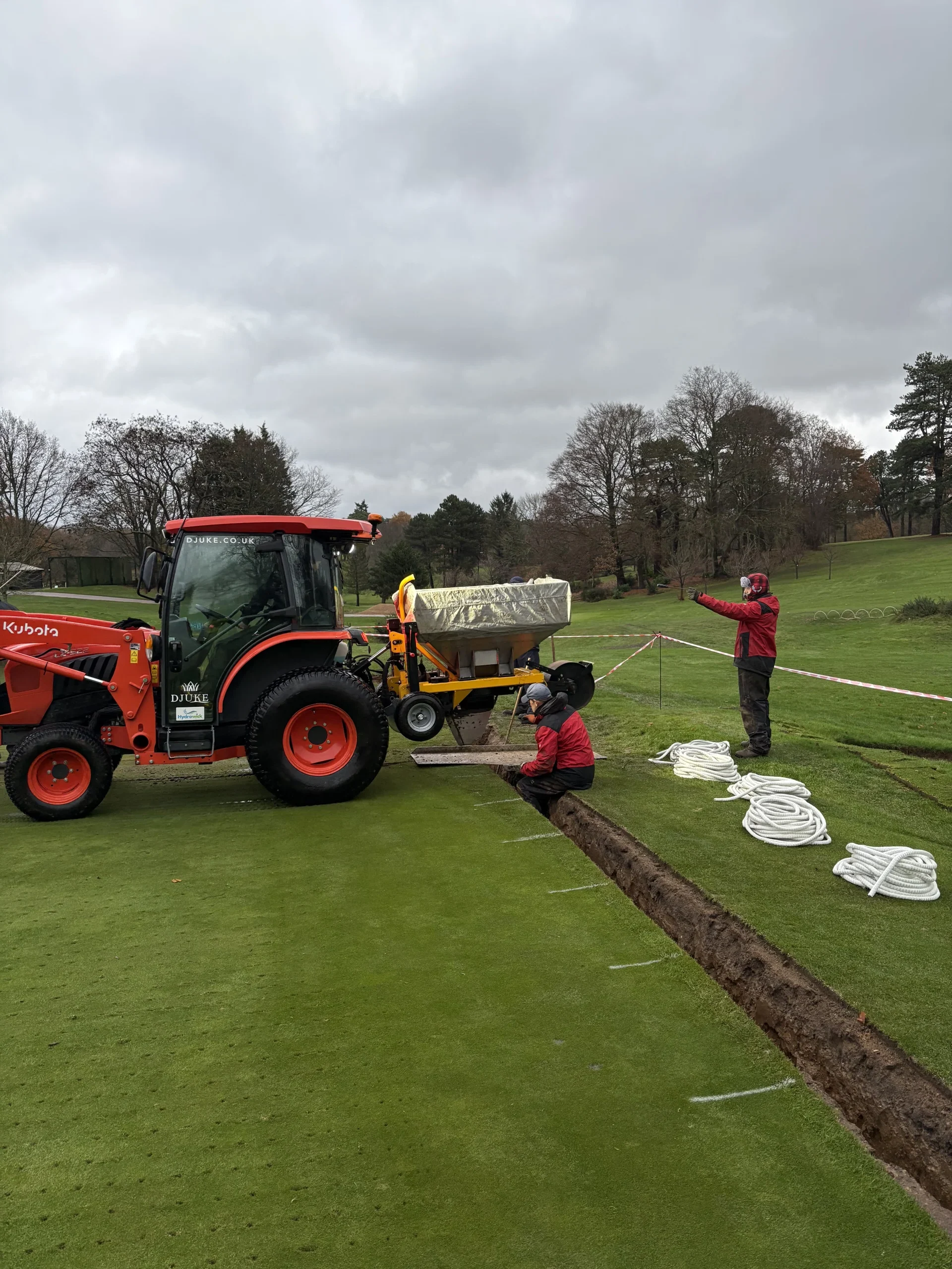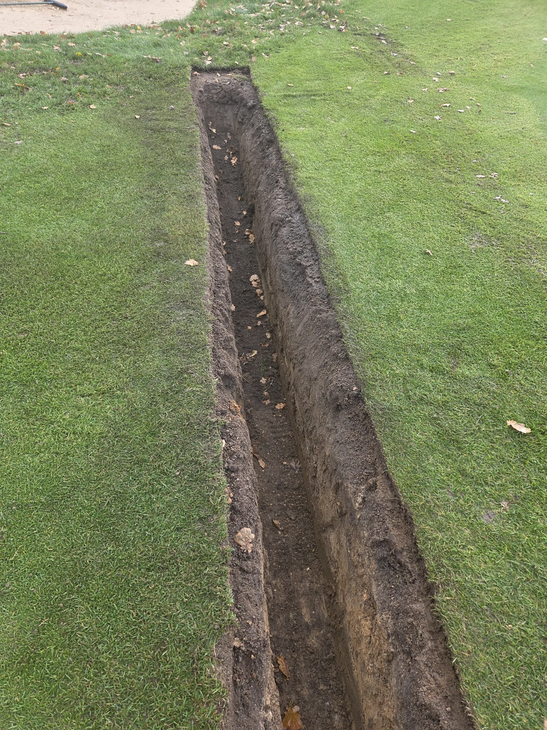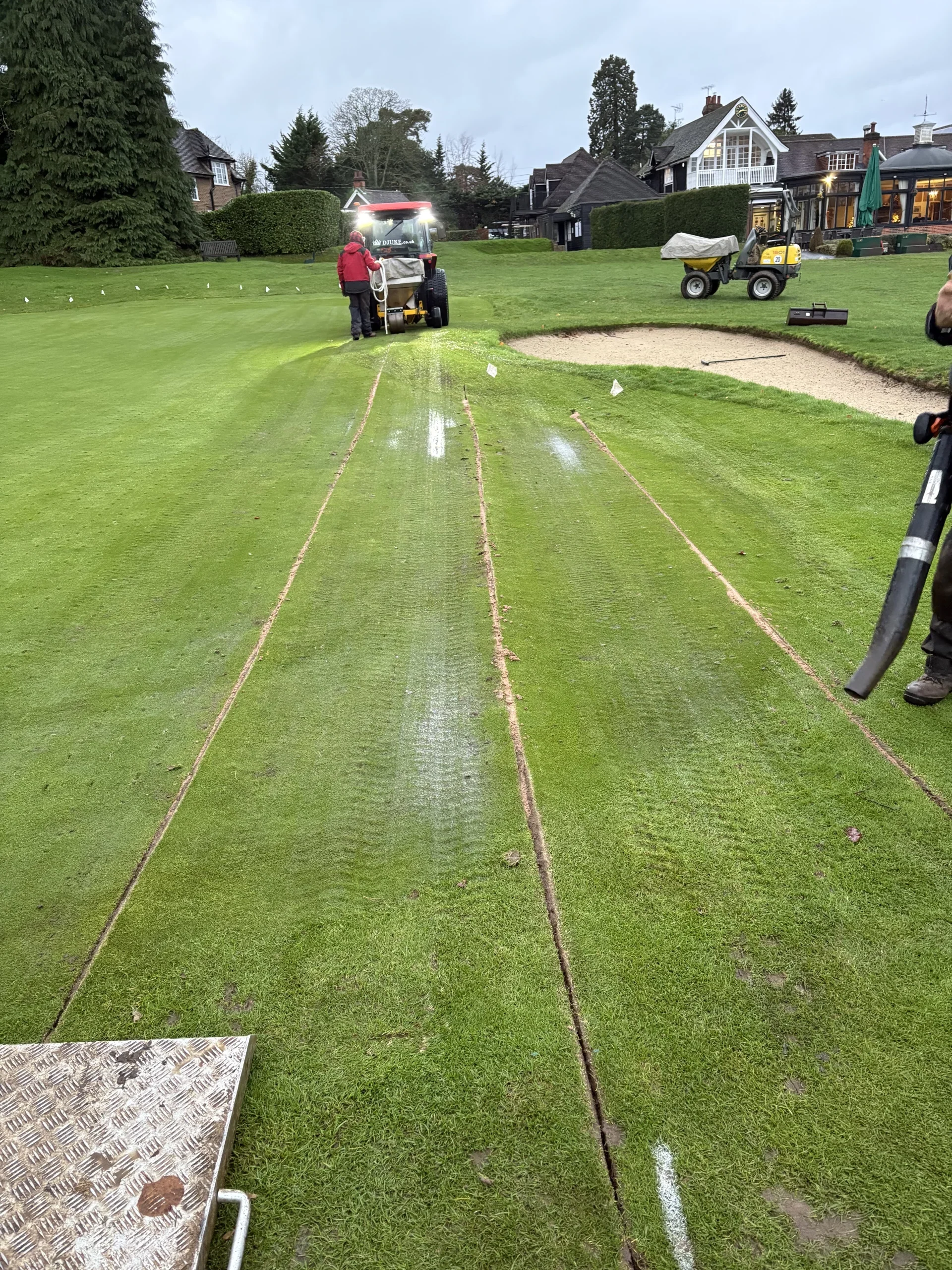 För att garantera våra framtida kunder ett gott resultat från dag ett fick vi vara med och installera Hydrowick på Porters Park GC, vilket var extremt nyttigt och framförallt förvånande över Hyrdowicks effektivitet. Under måndagen regnade det hela eftermiddagen och natten till tisdag, när vi påbörjade Hyrdowickinstallationen på tisdagen fick vi avbryta efter halva processen på första greenen pga regnet. Vi fick endast ner repen i marken och kunde inte återställa ytorna helt, eller fortsätta till dem andra greenerna vi skulle göra för den delen heller.