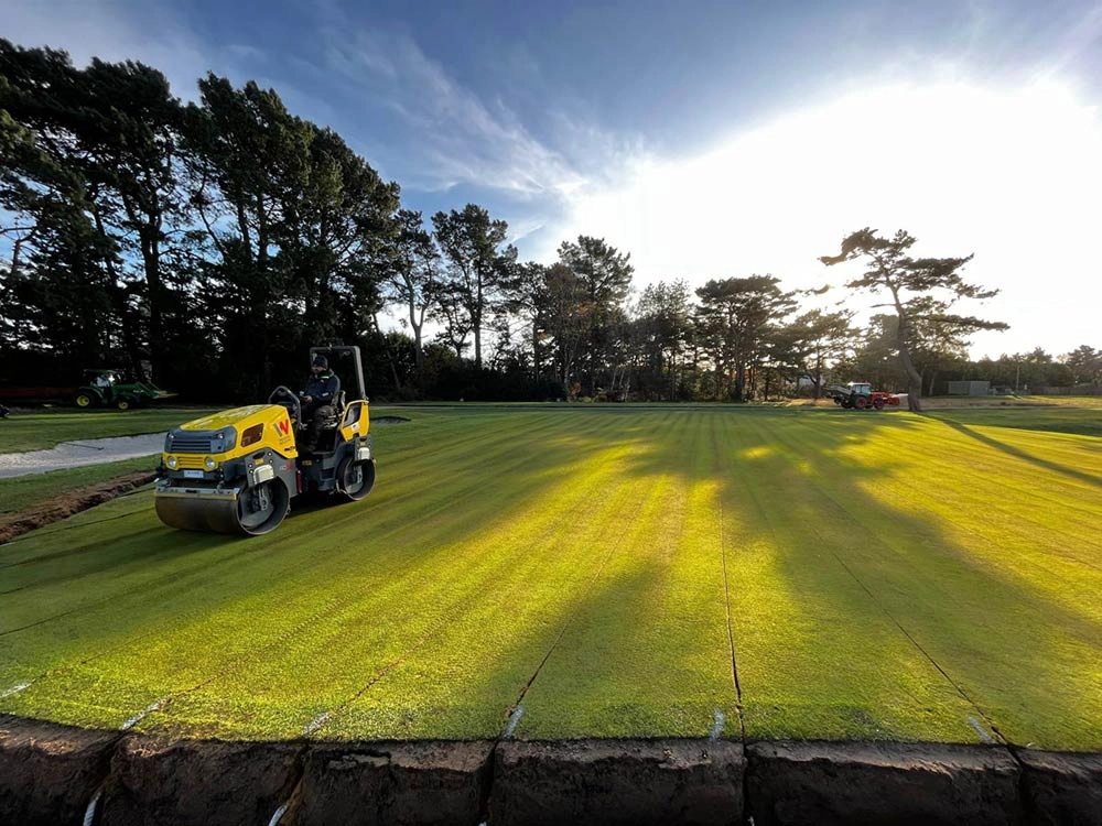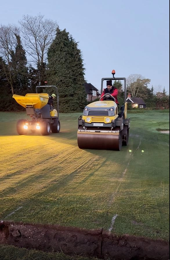 På onsdagen blev vi rejält förvånade när greenen vi installerat var näst intill helt torr och vi kunde fortsätta processen i form av köra över skarvarna på greenen med dumper, för att sedan välta allting.