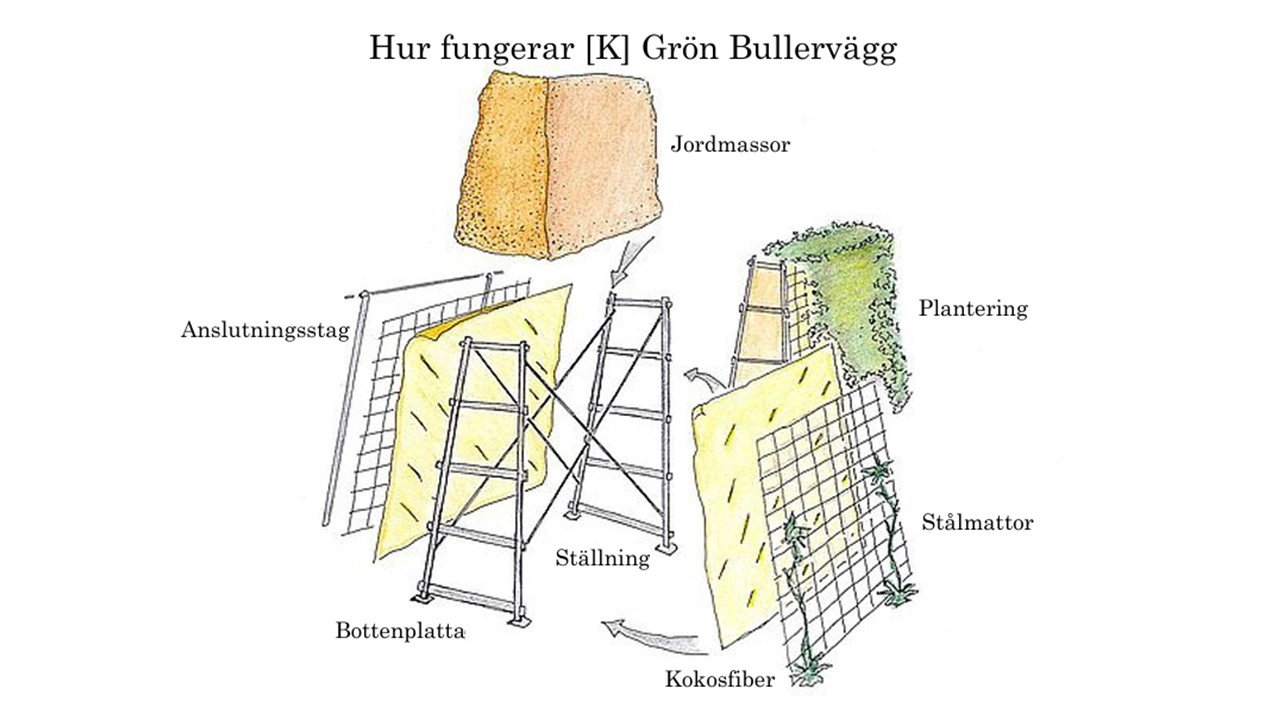 Själva väggen består av galvaniserade stålväggar med ett modulärt instickssystem (plug-in) som ger hög stabilitet och gör det enkelt att anpassa höjd och sträckning efter platsens krav. Konstruktionen har en toppbredd på 0,8 meter oavsett väggens höjd, som kan byggas från 1 till 8 meters höjd. För att hålla schaktmassorna på plats klär du stålstommen med flera skikt kokosväv i kombination med stålmattor. Kokosväven förhindrar att bullerväggens fyllning rinner ut.